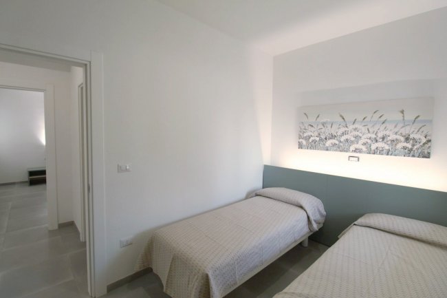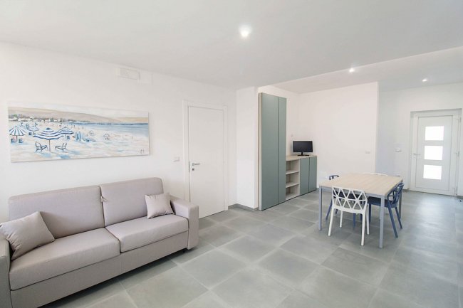 trilocale in muratura; piano terra o 1° piano; aria condizionata; angolo cottura; frigo; tv; 1 camera con letto matrimoniale; 2a camera con 2 letti singoli o letto matrimoniale; bagno con doccia e bidet. Patio esterno attrezzato.