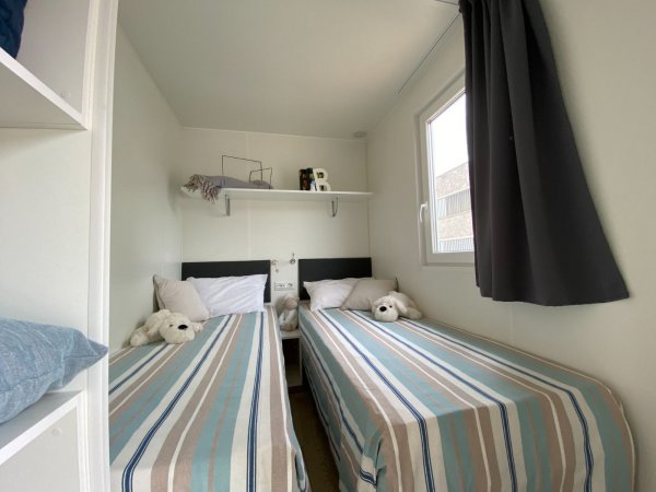 casa mobile trilocale; aria condizionata; area giorno con angolo cottura, frigo a colonna; tv; 1a camera con letto matrimoniale; 2a camera con 2 letti singoli + 1 letto di dimensioni ridotte attaccato alla parete (adatto ad una persona di massimo 150 cm e 60 kg); bagno con box doccia e bidet. Veranda esterna coperta.
